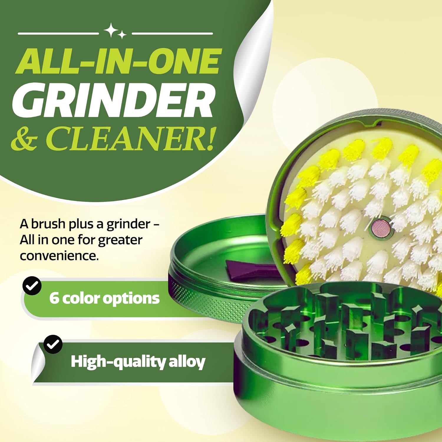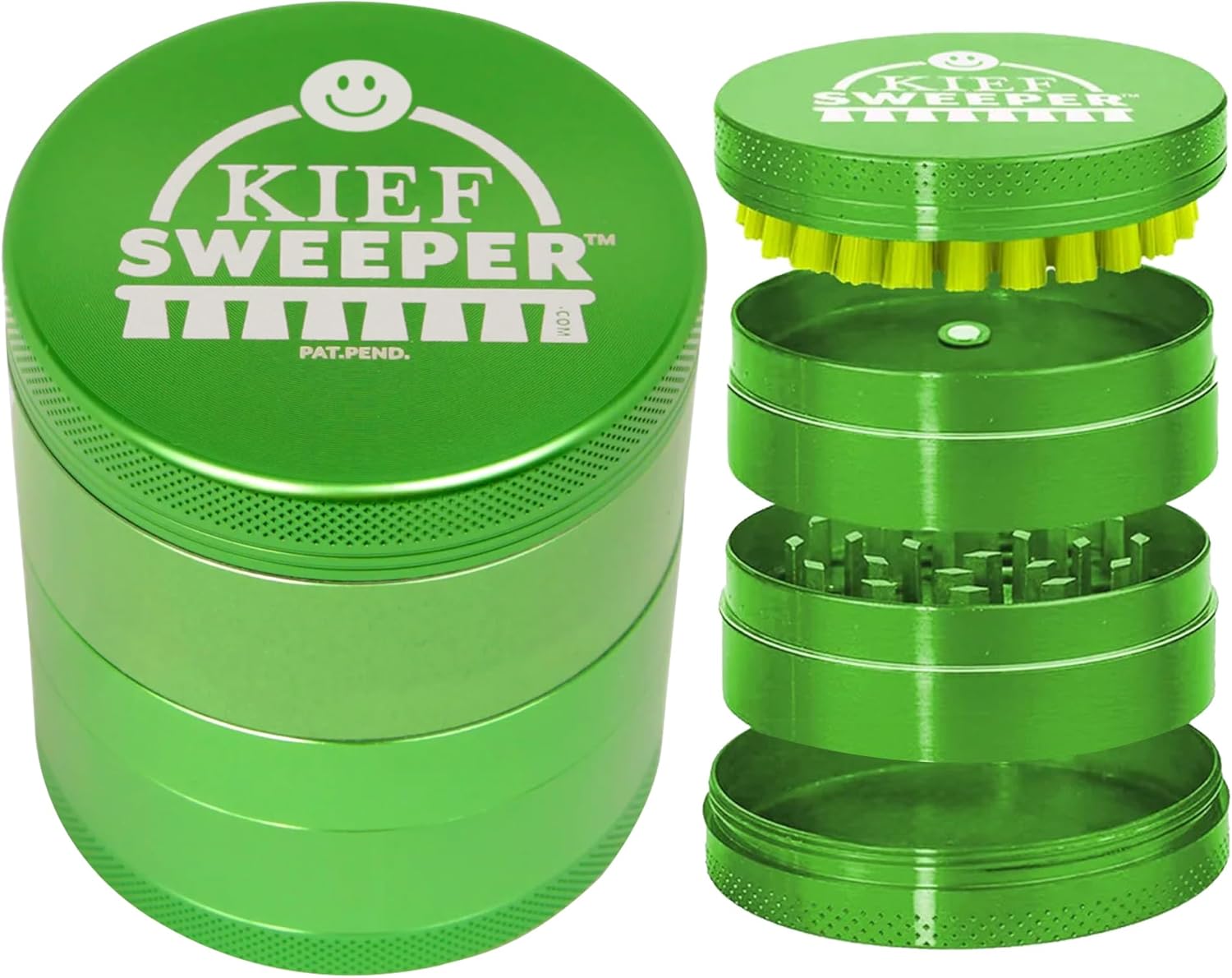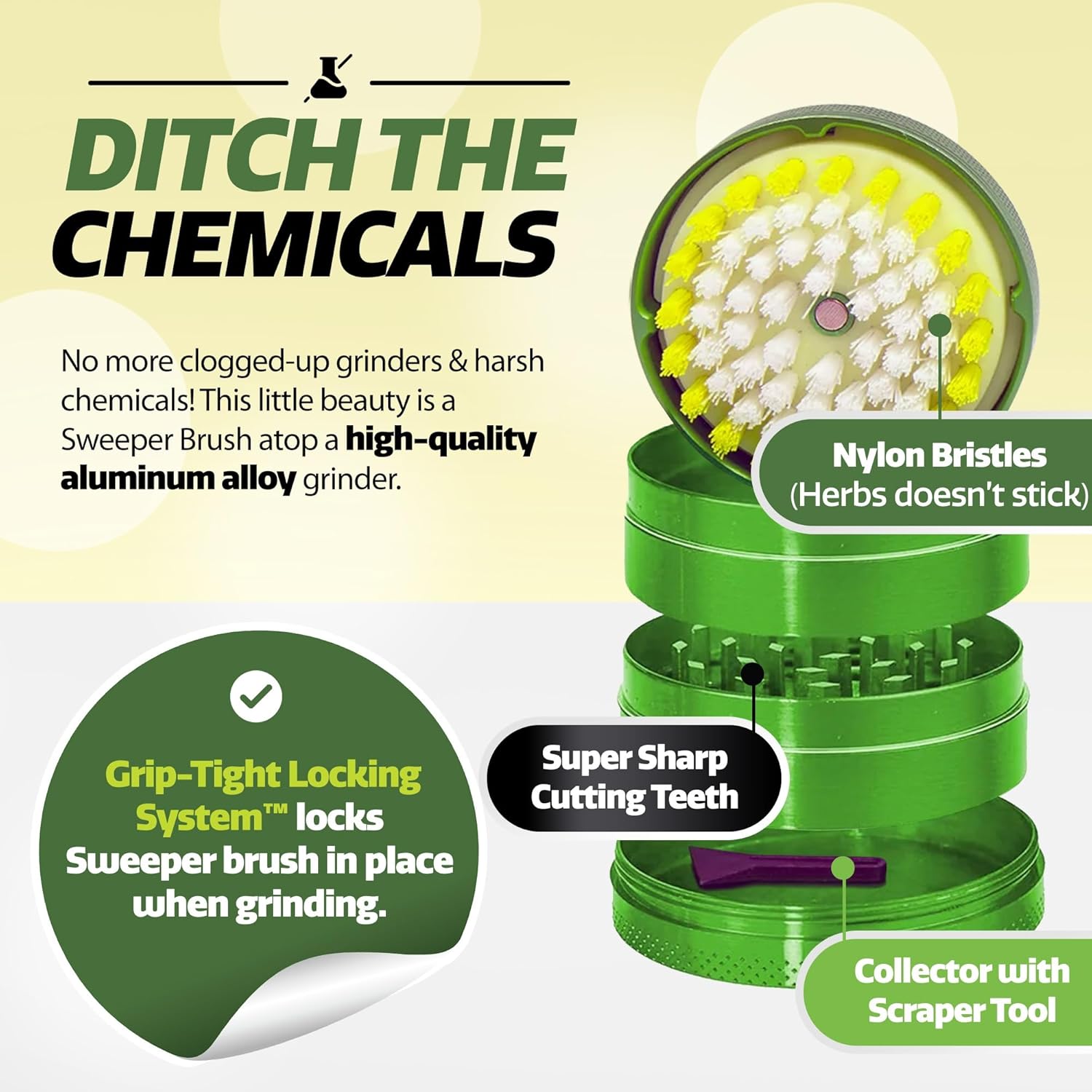The Kief Sweeper Brush Plus Grinder combines a 5-piece brush with a premium aluminum alloy grinder. Featuring the Grip-Tight Locking System™, it ensures smooth, chemical-free grinding and easy cleanup—all in one sleek package!